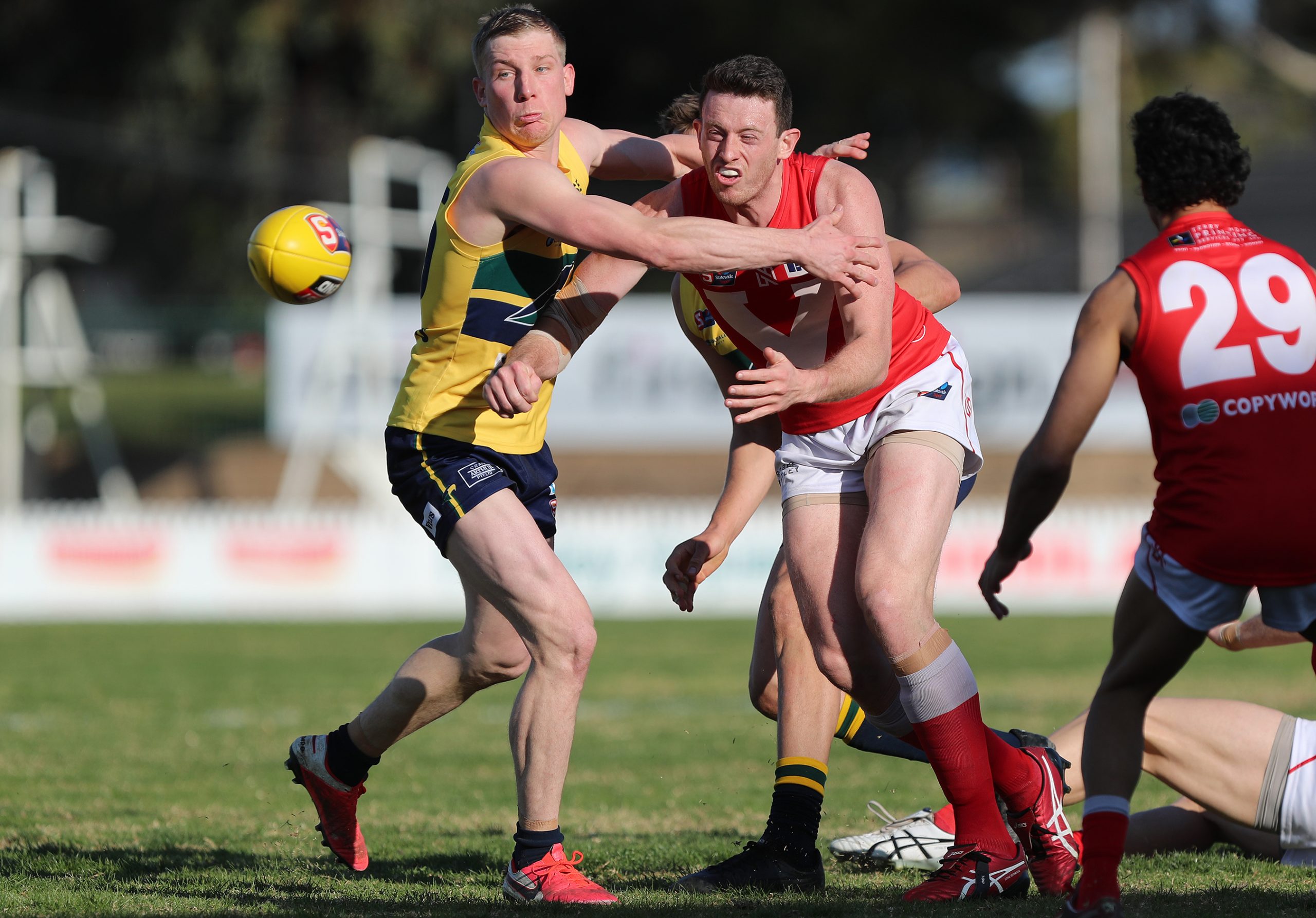 North ruckman James Craig gets a handball away despite pressure from Eagle Joseph Sinor. Picture – Deb Curtis