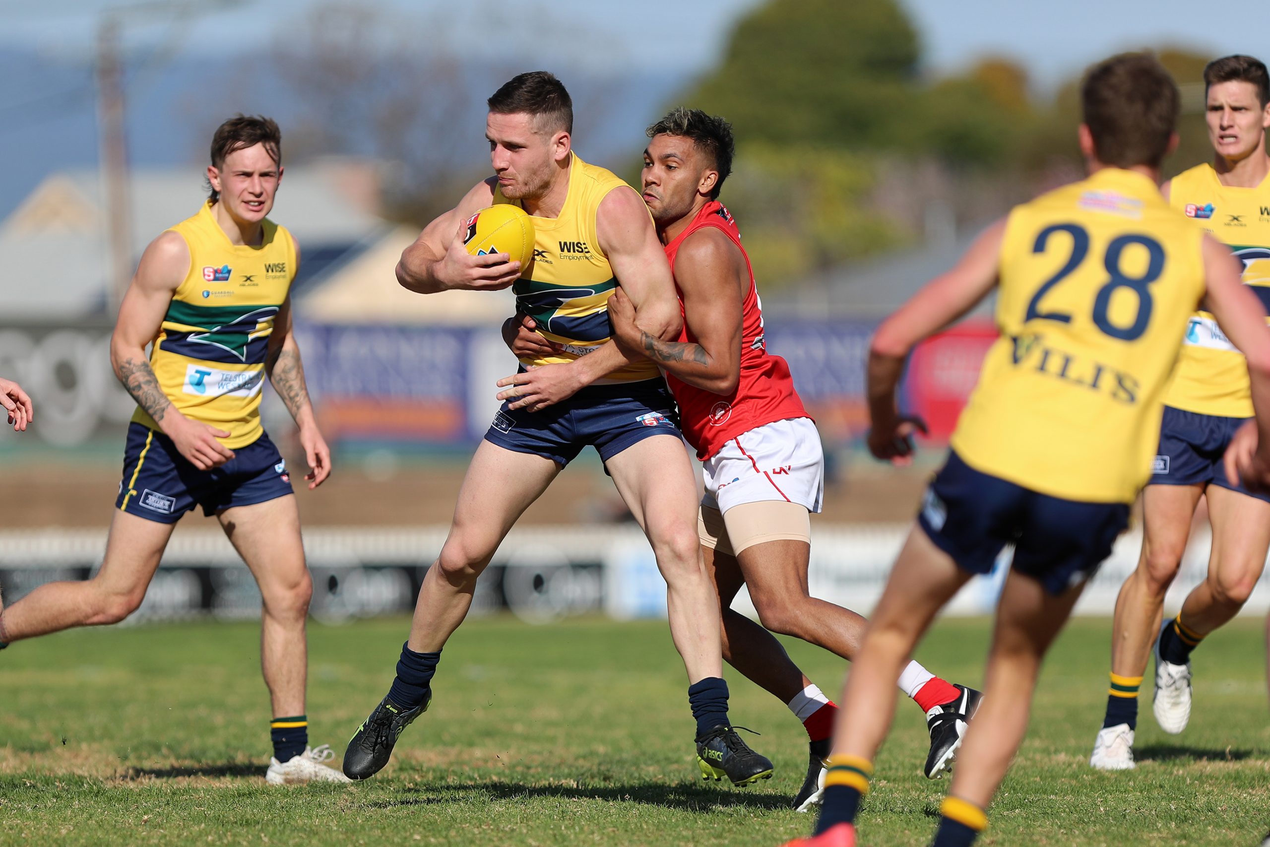 Eagle James Tsitas is wrapped up by North’s Kym Lebois. Picture – Deb Curtis