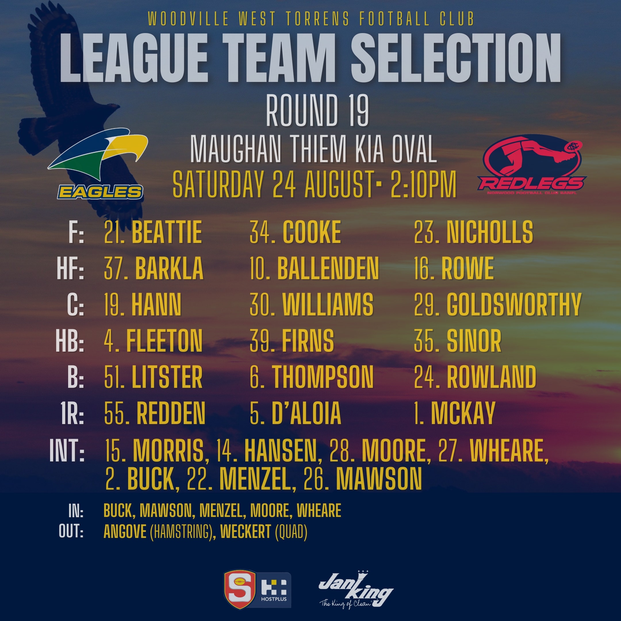 Out: Buck (League), Mawson (League), Menzel (League), Moore (League), Ueding (Hamstring), Wheare (League)